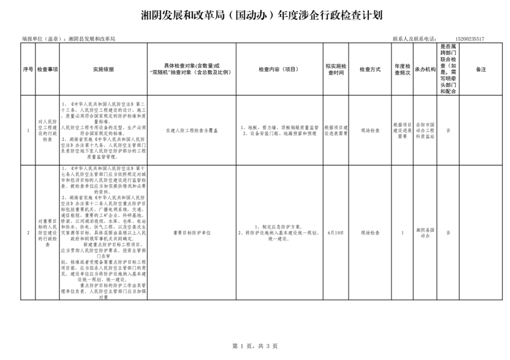 湘阴发展和改革局(国动办)年度涉企行政检查计划