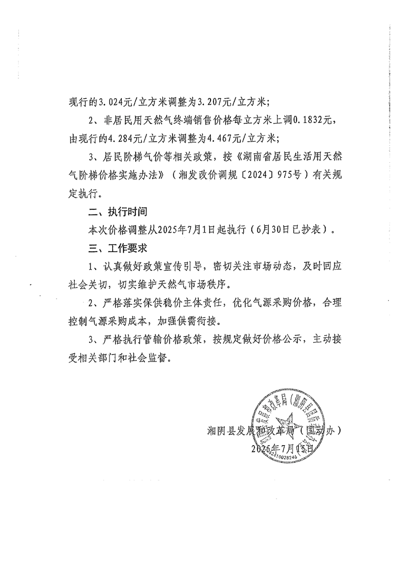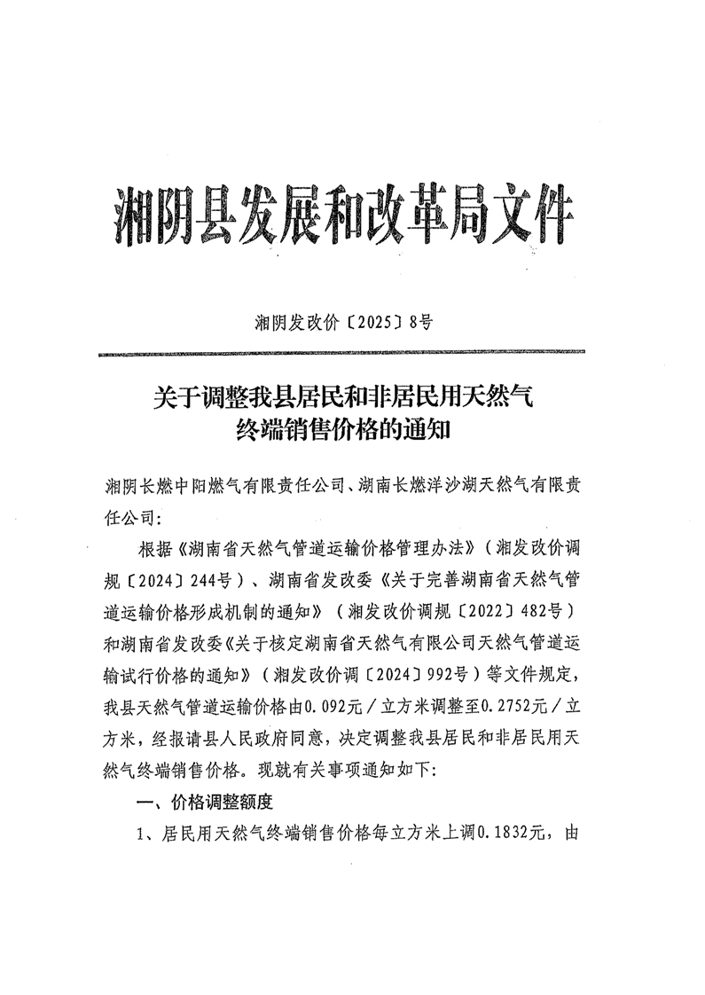 关于调整我县居民和非居民用天然气终端销售价格的通知(湘阴发改价〔2025〕8号)