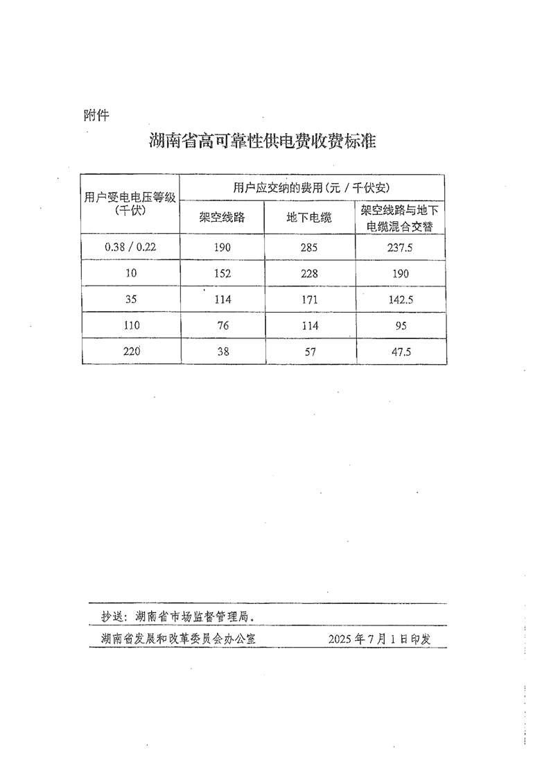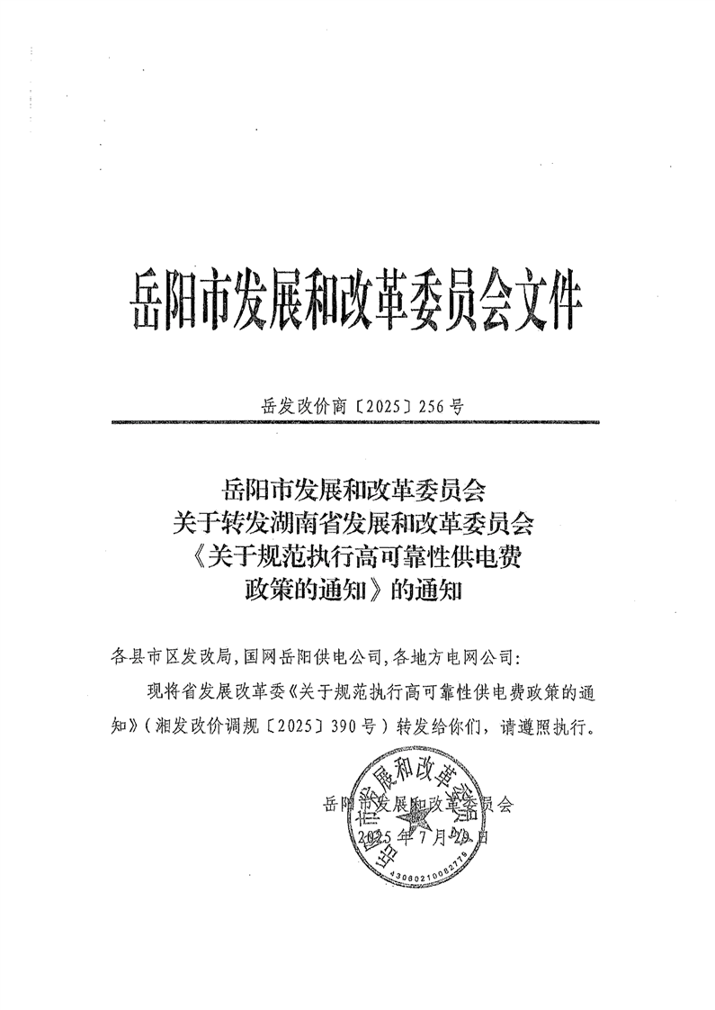岳阳市发展和改革委员会 关于转发湖南省发展和改革委员会《关于规范执行高可靠性供电费政策的通知》的通知 岳发改价商〔2025〕256号
