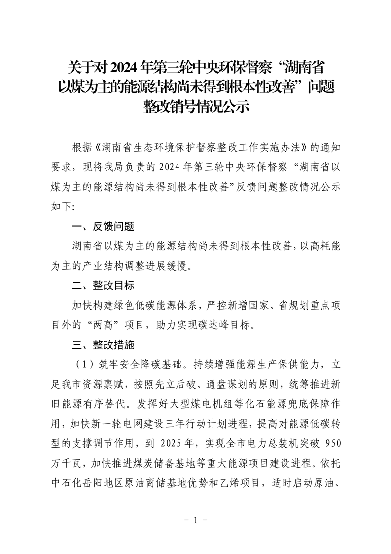 关于对2024年第三轮中央环保督察“湖南省以煤为主的能源结构尚未得到根本性改善”问题整改销号情况公示