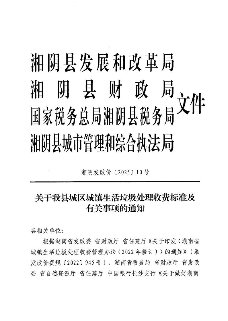 湘阴县发展和改革局 湘阴县财政局 国家税务总局湘阴县税务局 湘阴县城市管理和综合执法局 关于我县城区城镇生活垃圾处理收费标准及有关事项的通知(湘阴发改价〔2025〕10号)