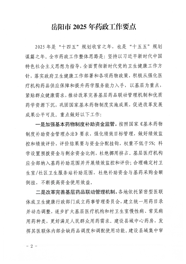 转发岳阳市卫生健康委药政科关于印发岳阳市2025年药政工作要点的通知