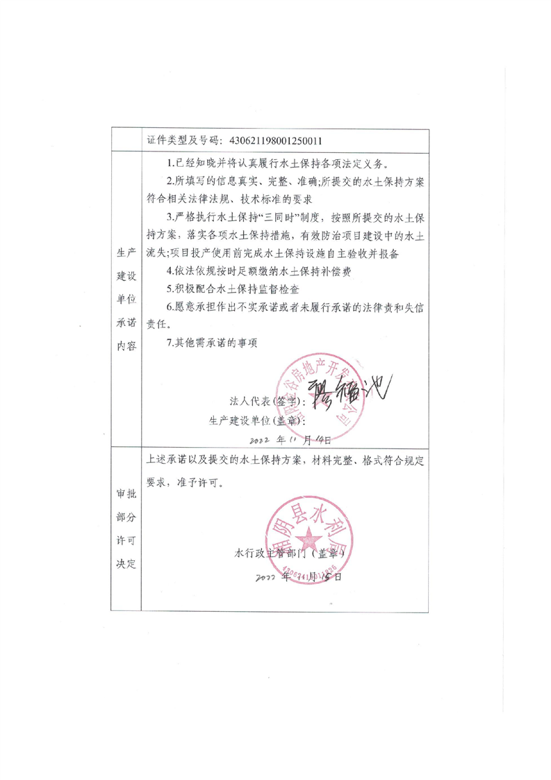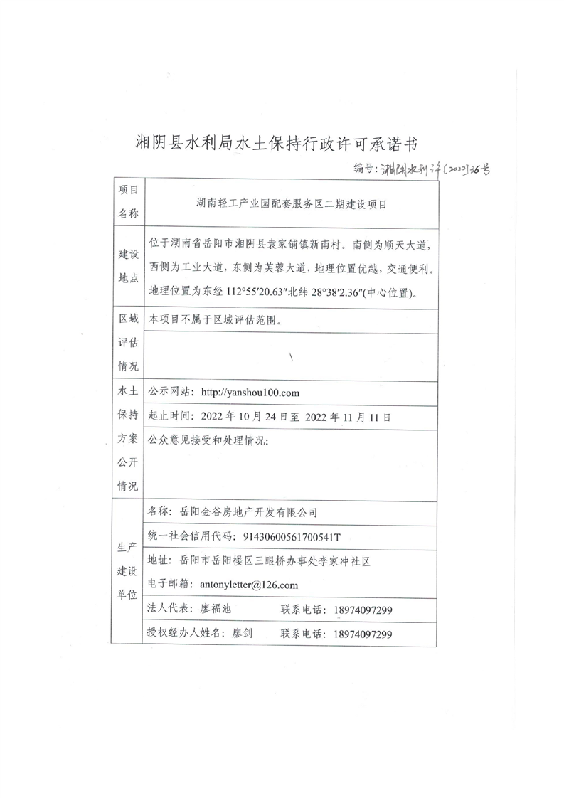 湖南轻工业园配套服务区二期建设项目水土保持行政许可承诺书