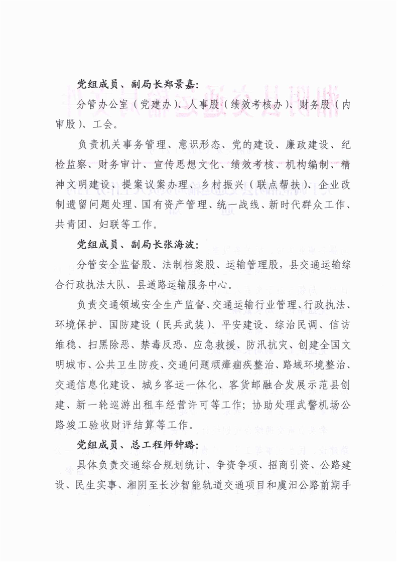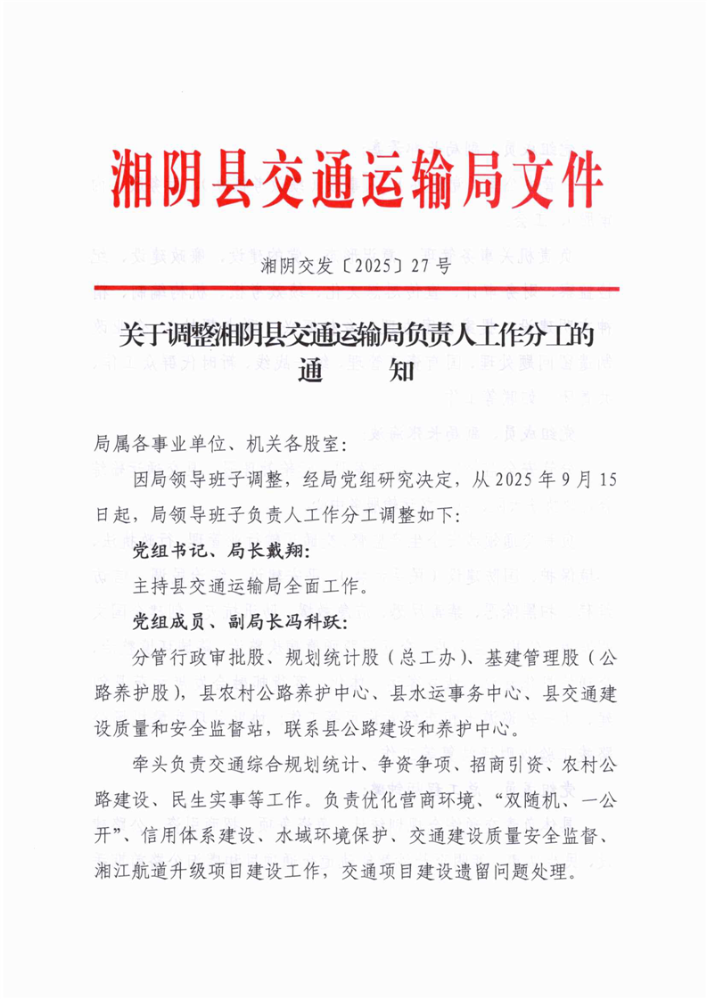 关于调整湘阴县交通运输局负责人工作分工的通知