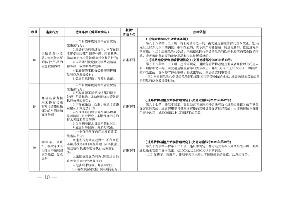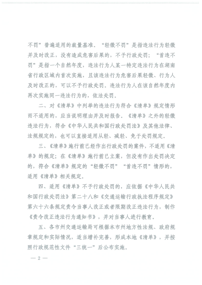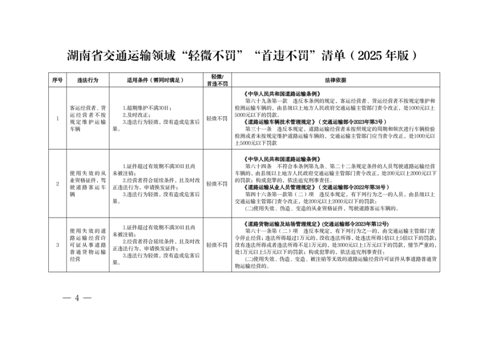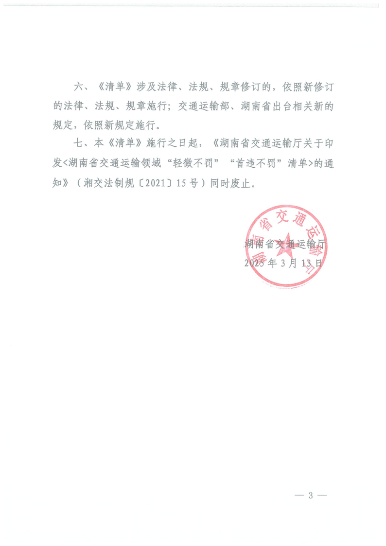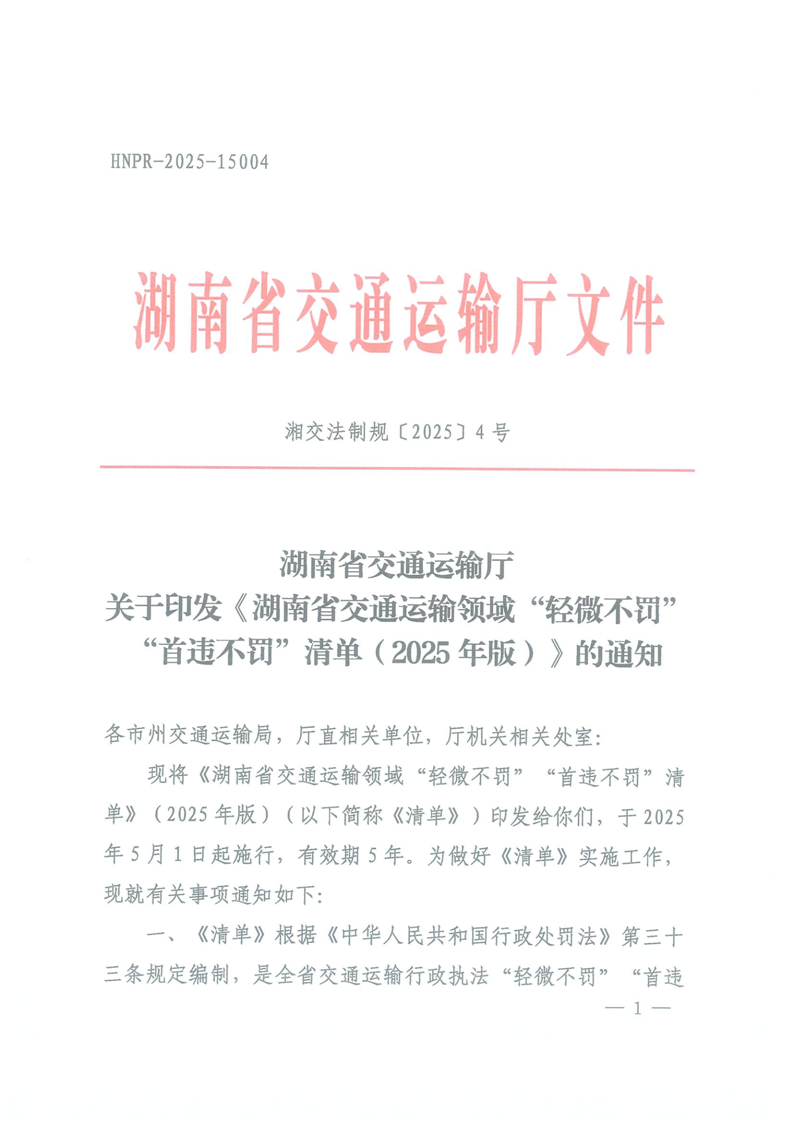 关于印发《湖南省交通运输领域“轻微不罚”“首违不罚”清单(2025年版)》的通知
