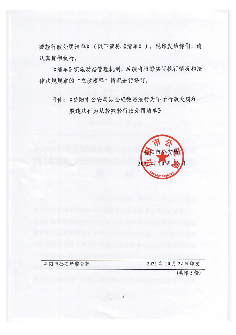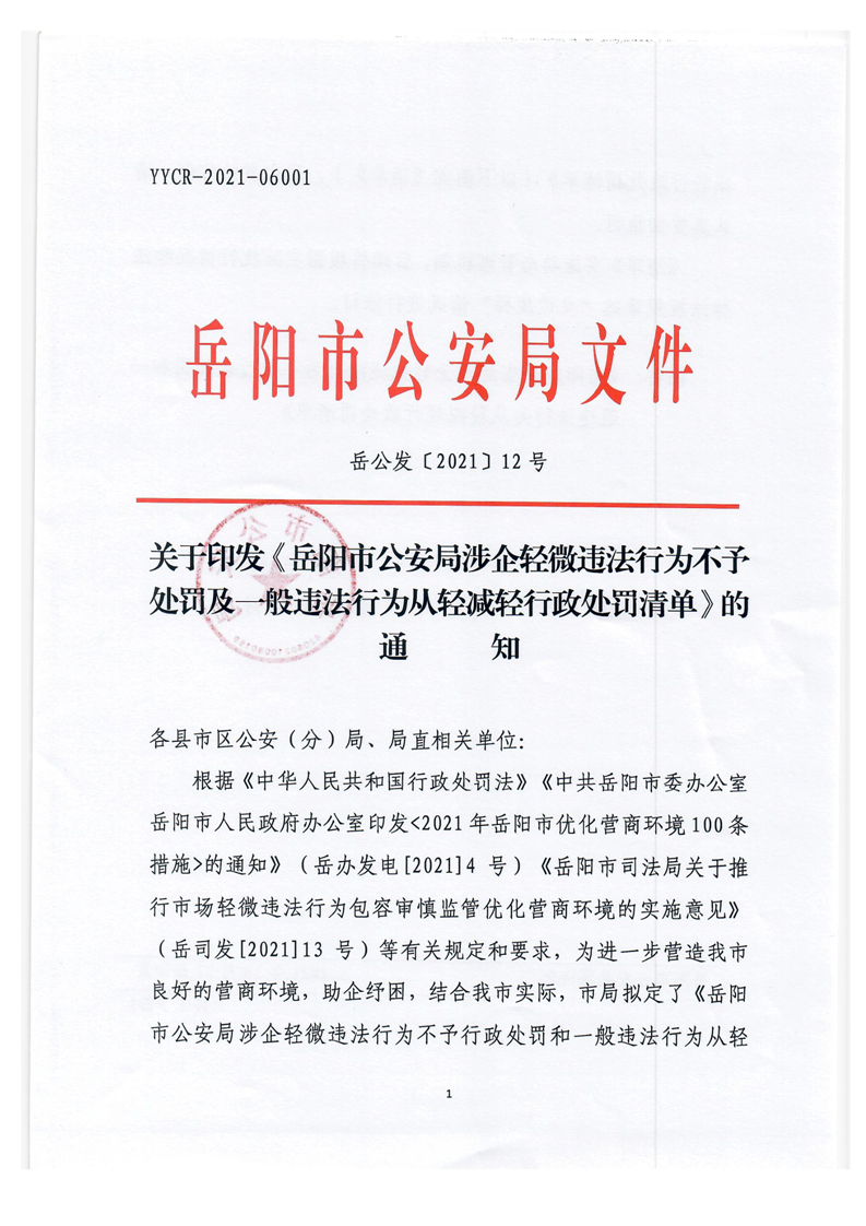 关于印发《岳阳市公安局涉企轻微违法行为不予处罚一般违法行为从轻减轻行政处罚清单》的通知