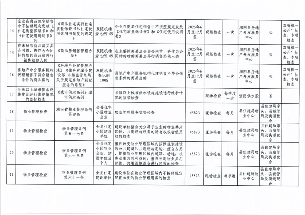湘阴县住房和城乡建设局2025年度涉企行政检查计划