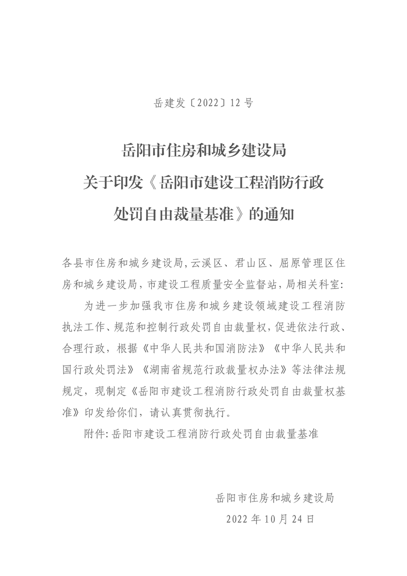 关于转发岳阳市住房和城乡建设局关于印发《岳阳市建设工程消防行政处罚自由裁量基准(2022版)》的通知