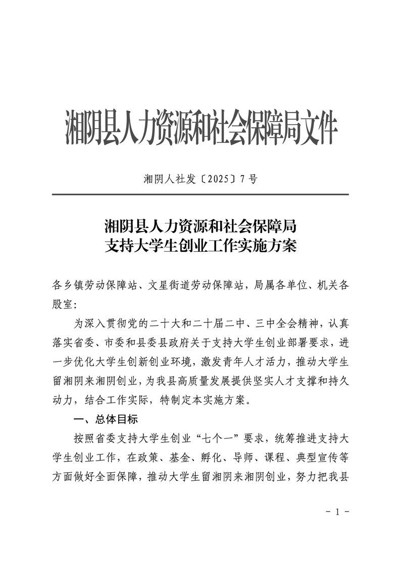 湘阴县人力资源和社会保障局支持大学生创业工作实施方案