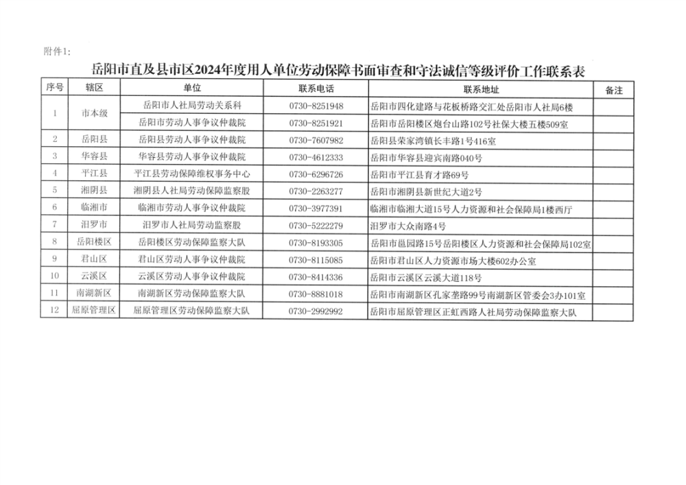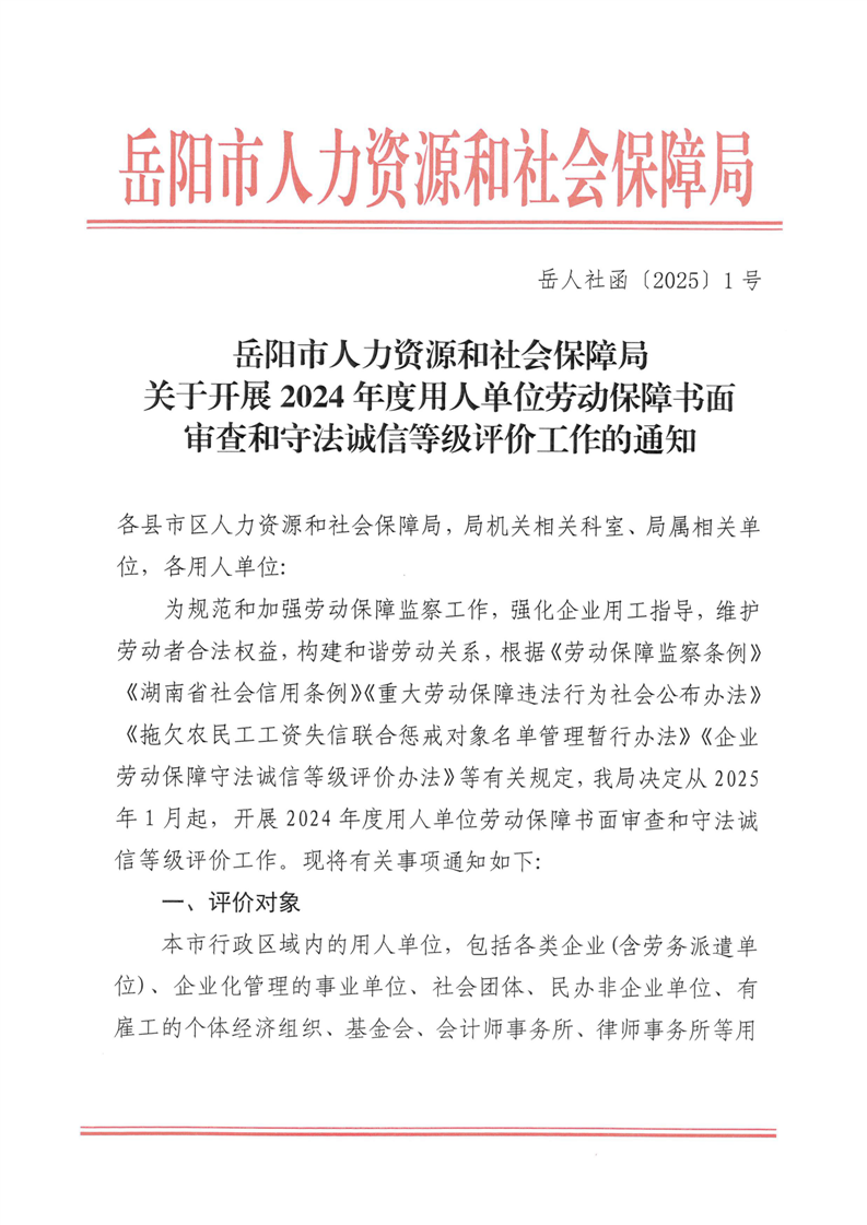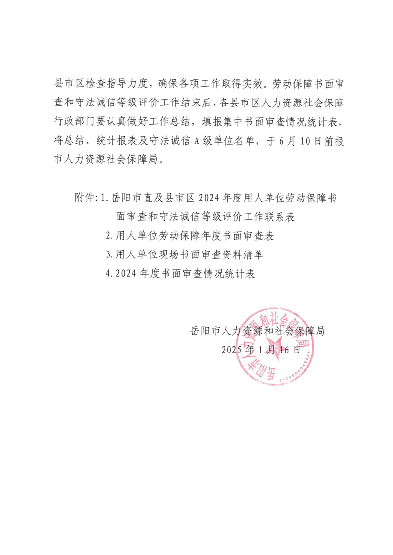 岳阳市人力资源和社会保障局关于开展2024年度用人单位劳动保障书面审查和守法诚信等级评价工作的通知