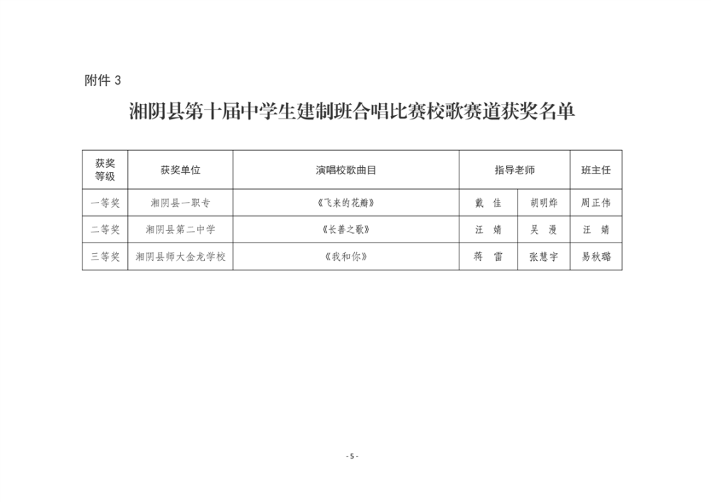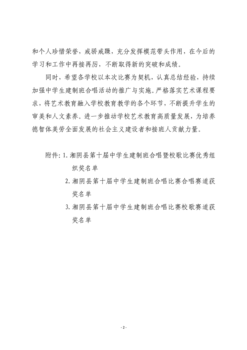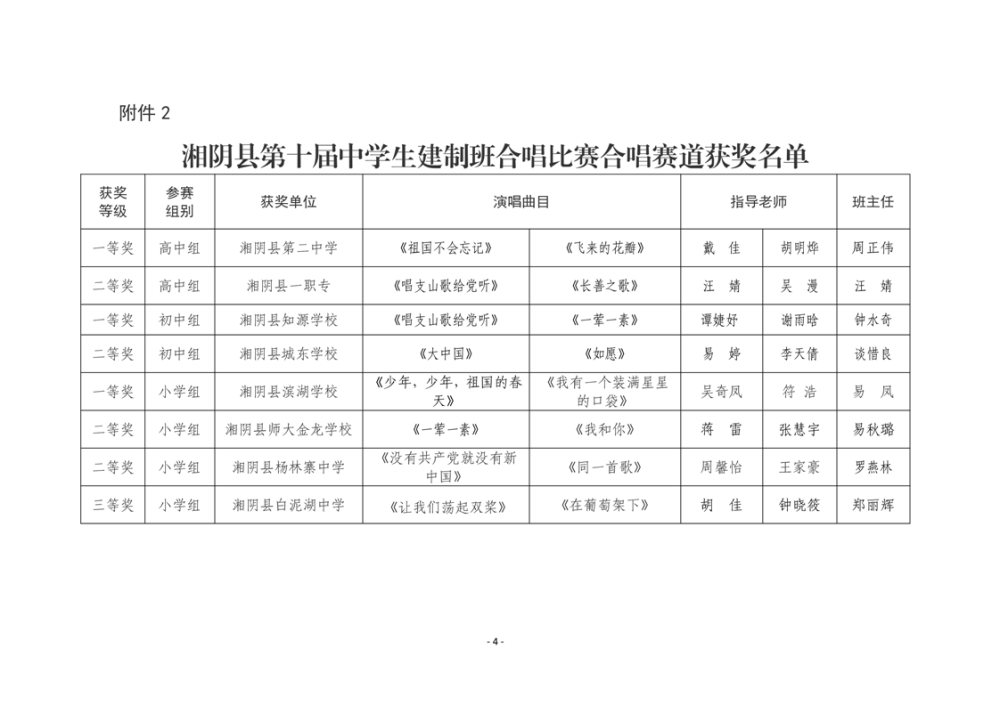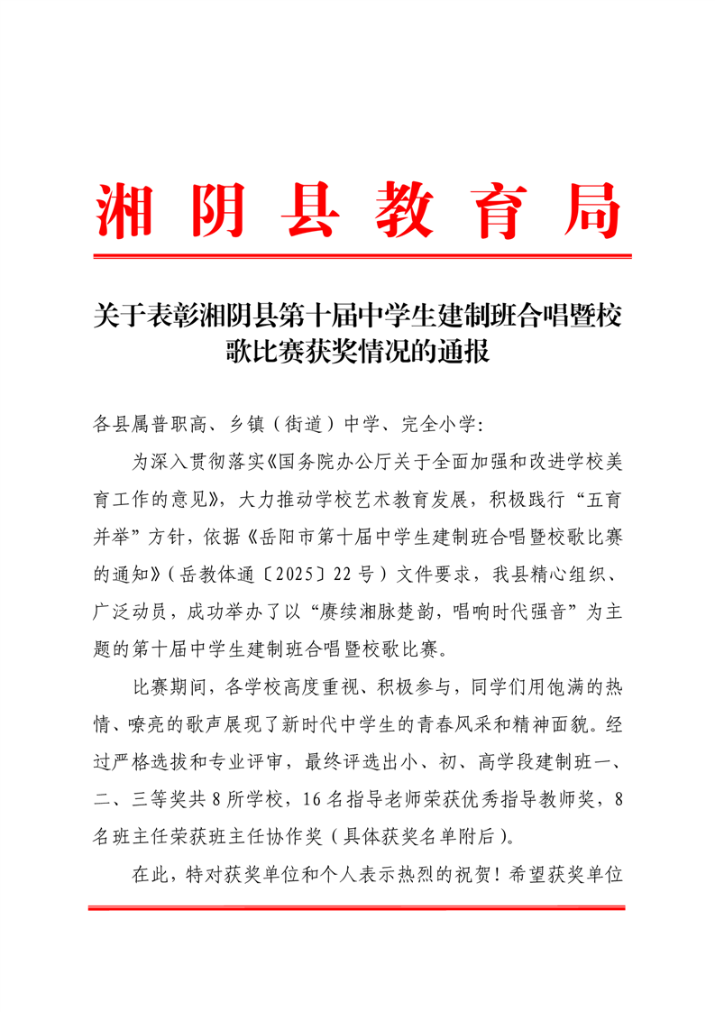 关于表彰湘阴县第十届中学生建制班合唱暨校歌比赛获奖情况的通报