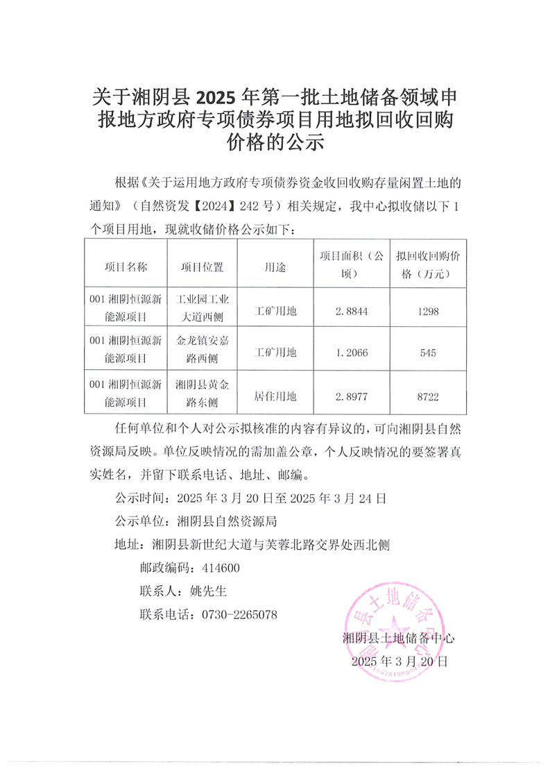 关于湘阴县2025年第一批土地储备领域申报地方政府专项债务项目用地拟回收回购价格的公示