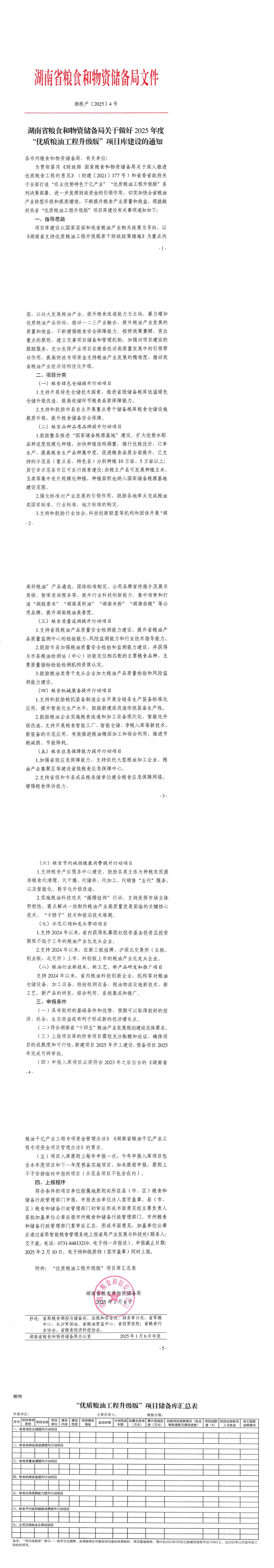 根据《湖南省粮食和物资储备局关于做好2025年度“优质粮油工程升级版”项目库建设的通知》(湘粮产〔2025〕4号)文件要求,为切实做好我县2025年度“优质粮油工程升级版”项目入库工作,请符合条件的项目单位对照省局文件要求进行申报,于2025年1月24日下班前将申报表电子档和纸质档(签字盖章)提交至县商务粮食局产业发展股。