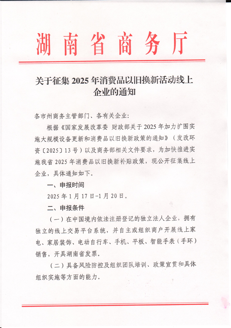 关于转发《湖南省商务厅关于征集2025年消费品以旧换新活动线上企业的通知》