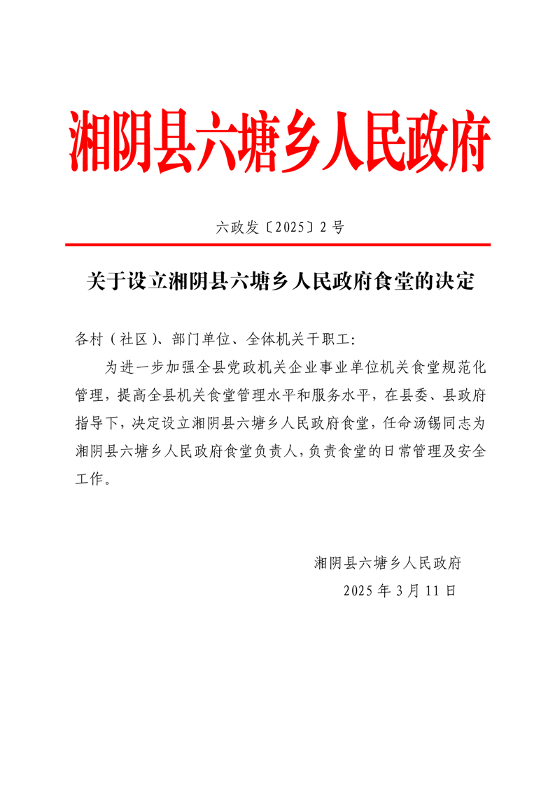 关于设立湘阴县六塘乡人民政府食堂的决定