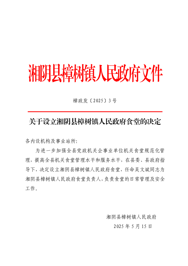 关于设立湘阴县樟树镇人民政府食堂的决定