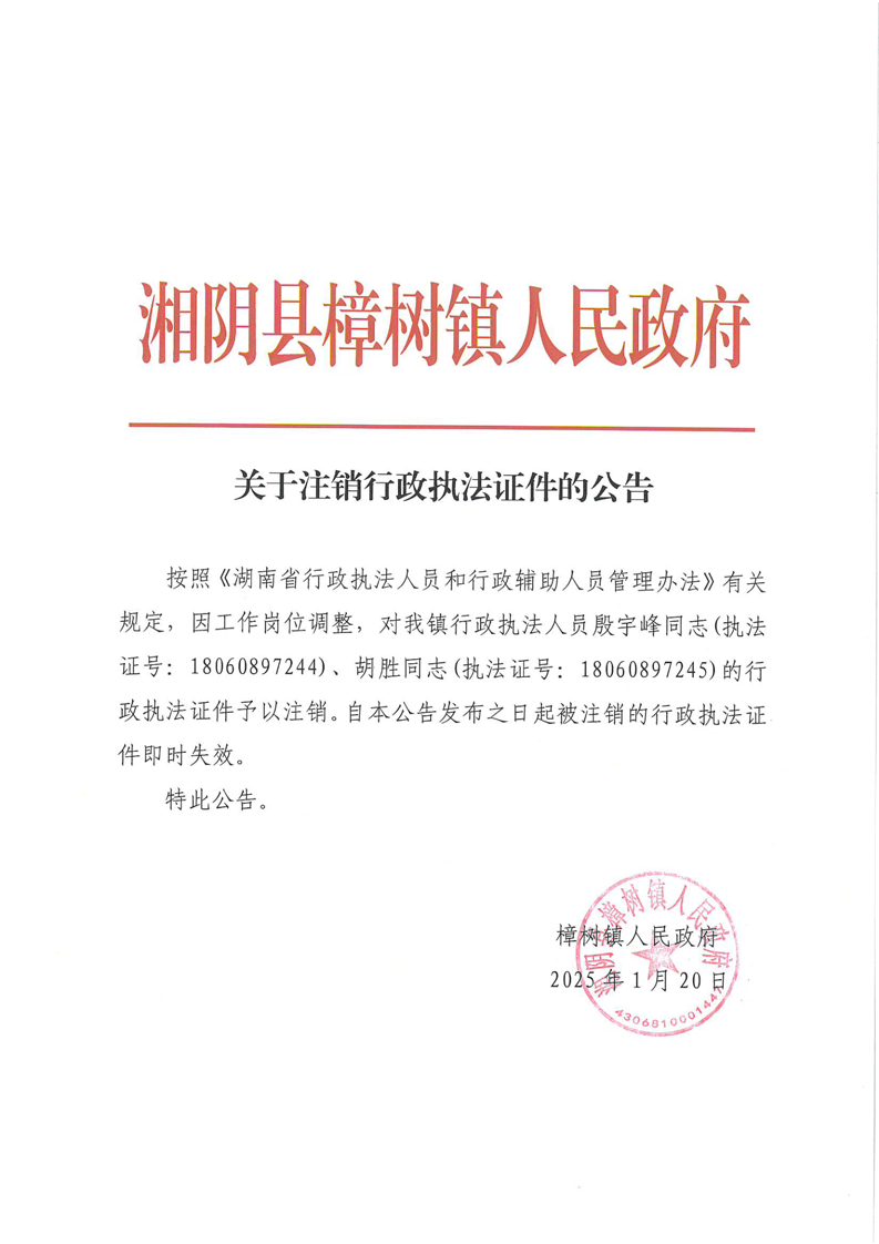 关于注销行政执法证件的公告(殷宇峰,胡胜)