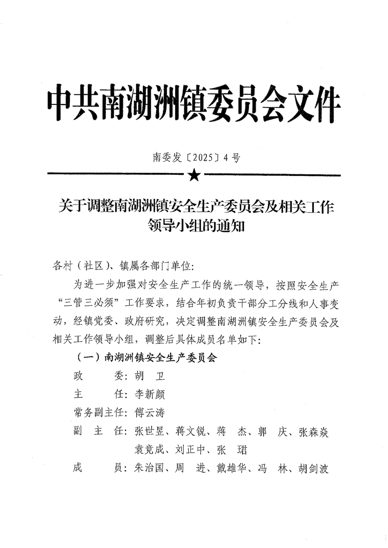 关于调整2025年南湖洲镇安全生产委员会及相关工作领导小组的通知