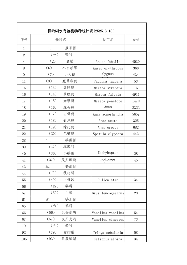 横岭湖省级自然保护区2025年3月18日水鸟监测物种统计表