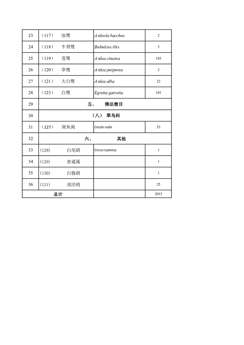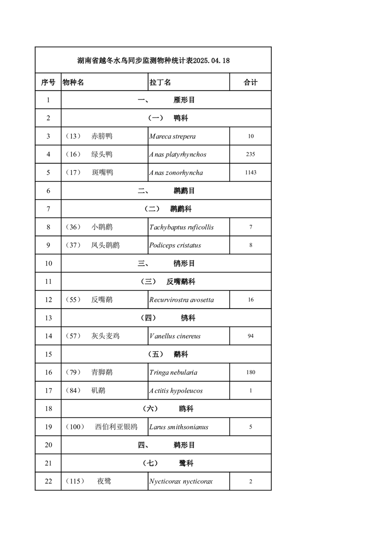 横岭湖省级自然保护区2025年4月18日水鸟监测物种统计表