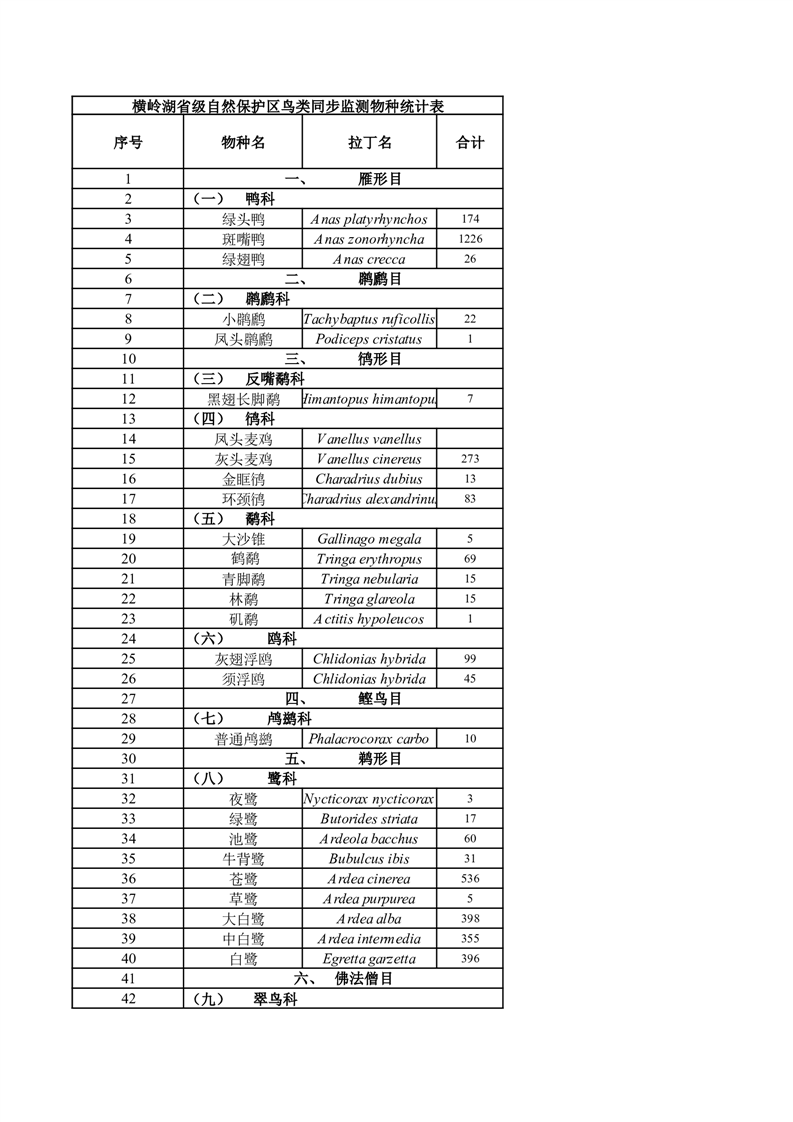 横岭湖省级自然保护区鸟类同步调查统计表(2025年9月18日)