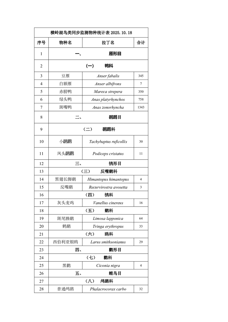 横岭湖省级自然保护区2025年10月18日水鸟同步监测物种统计表