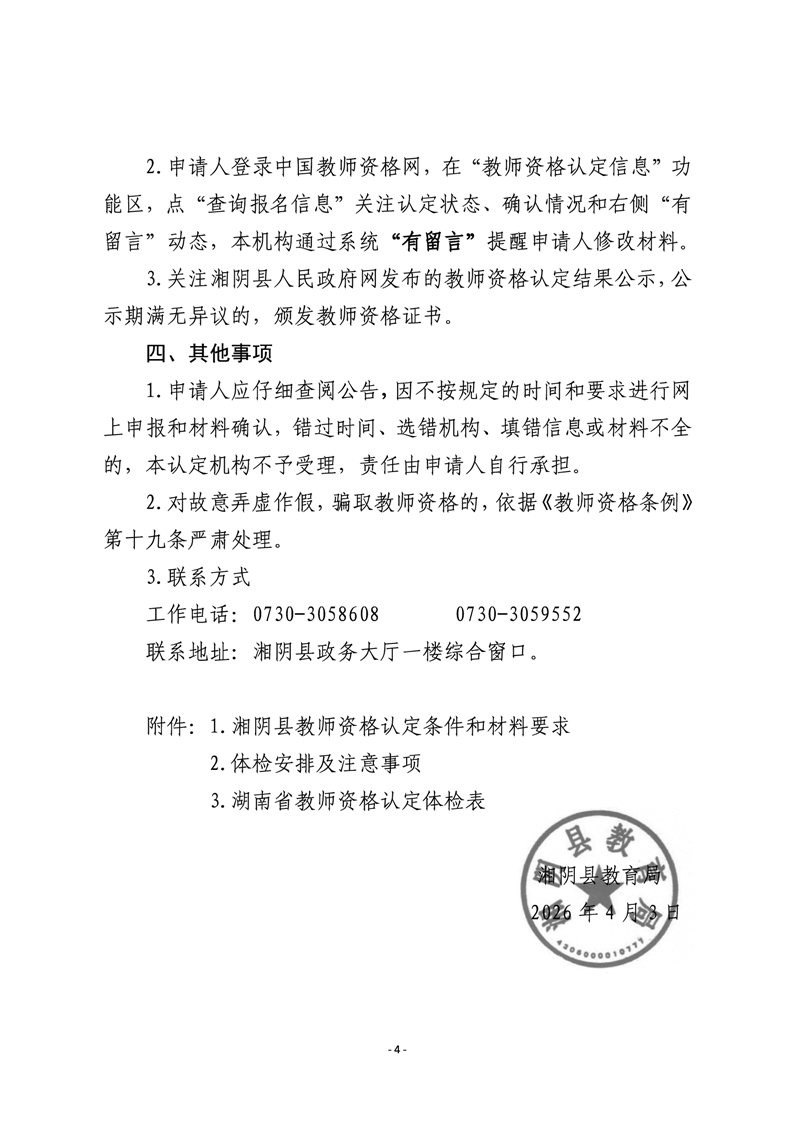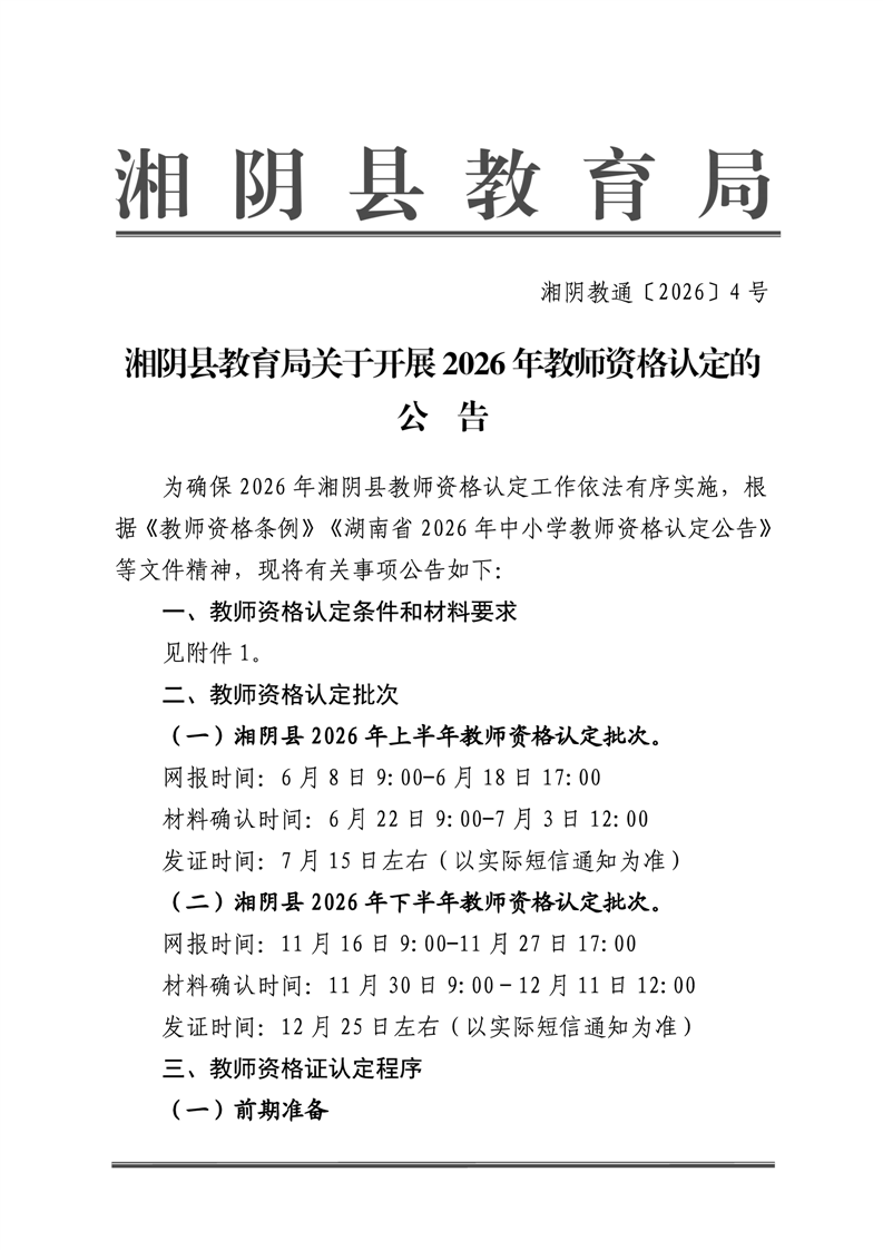 关于2026年度湘阴县教师资格认定有关事项的公告