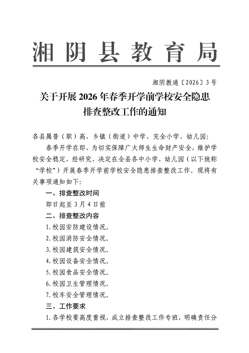 关于开展2026年春季开学前学校安全隐患排查整改工作的通知