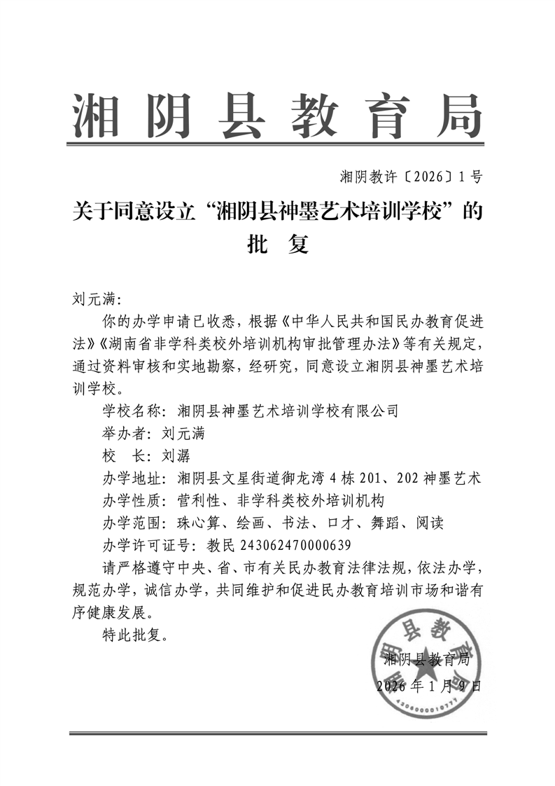 关于同意设立“湘阴县神墨艺术培训学校”的批复