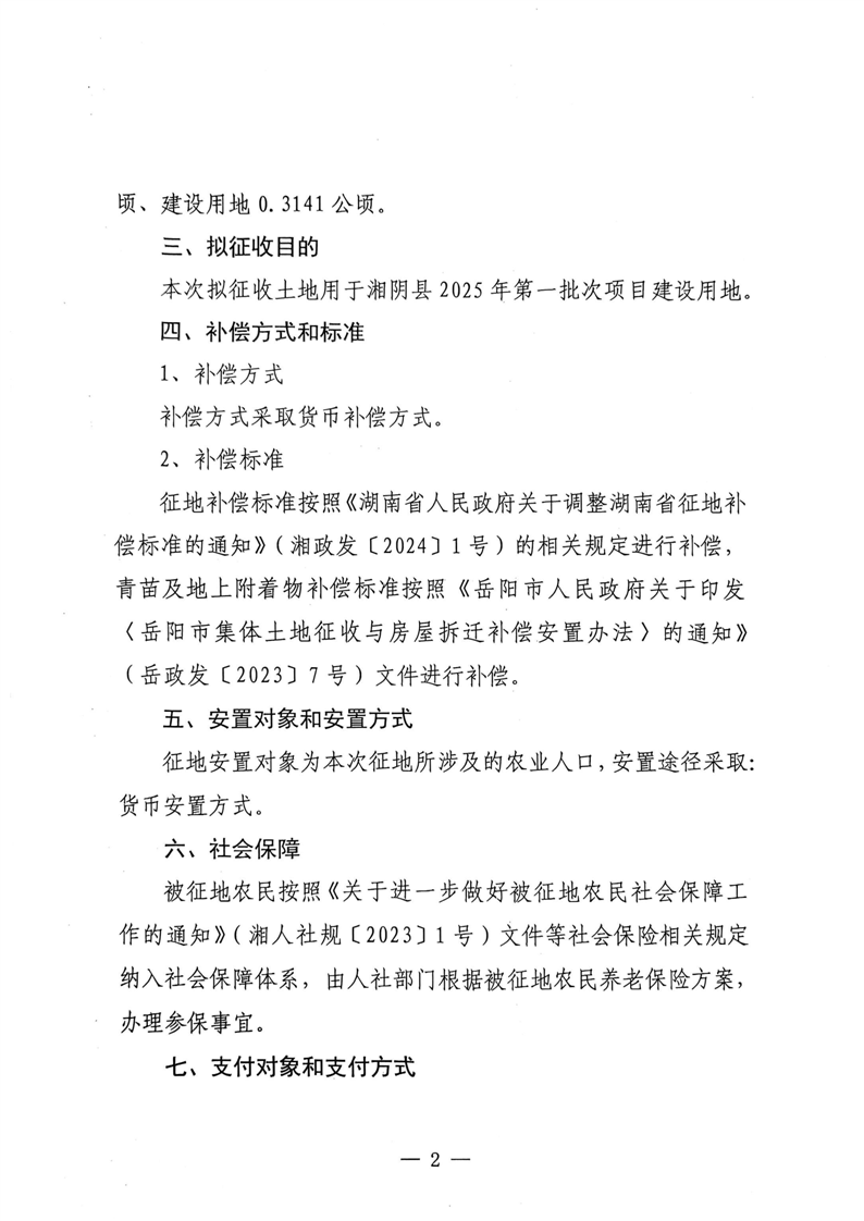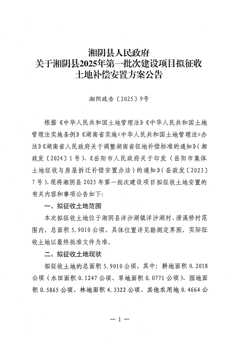湘阴县人民政府关于湘阴县2025年第一批次建设项目拟征收土地补偿安置方案公告