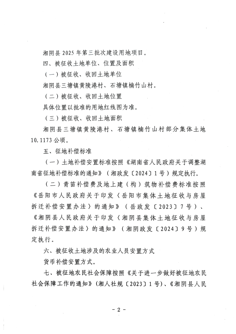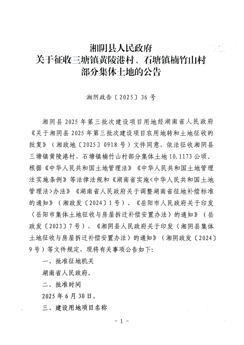 湘阴县人民政府关于征收三塘镇黄陵港村、石塘镇楠竹山村部分集体土地的公告