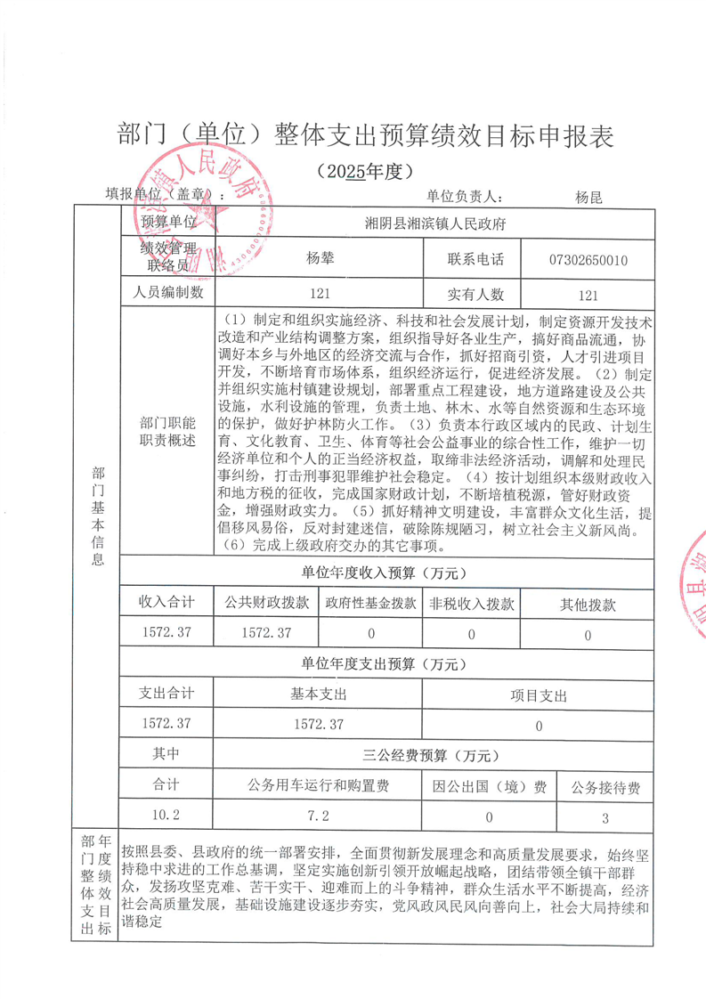 2025年-湘阴县湘滨镇人民政府-整体支出预算绩效目标申报表