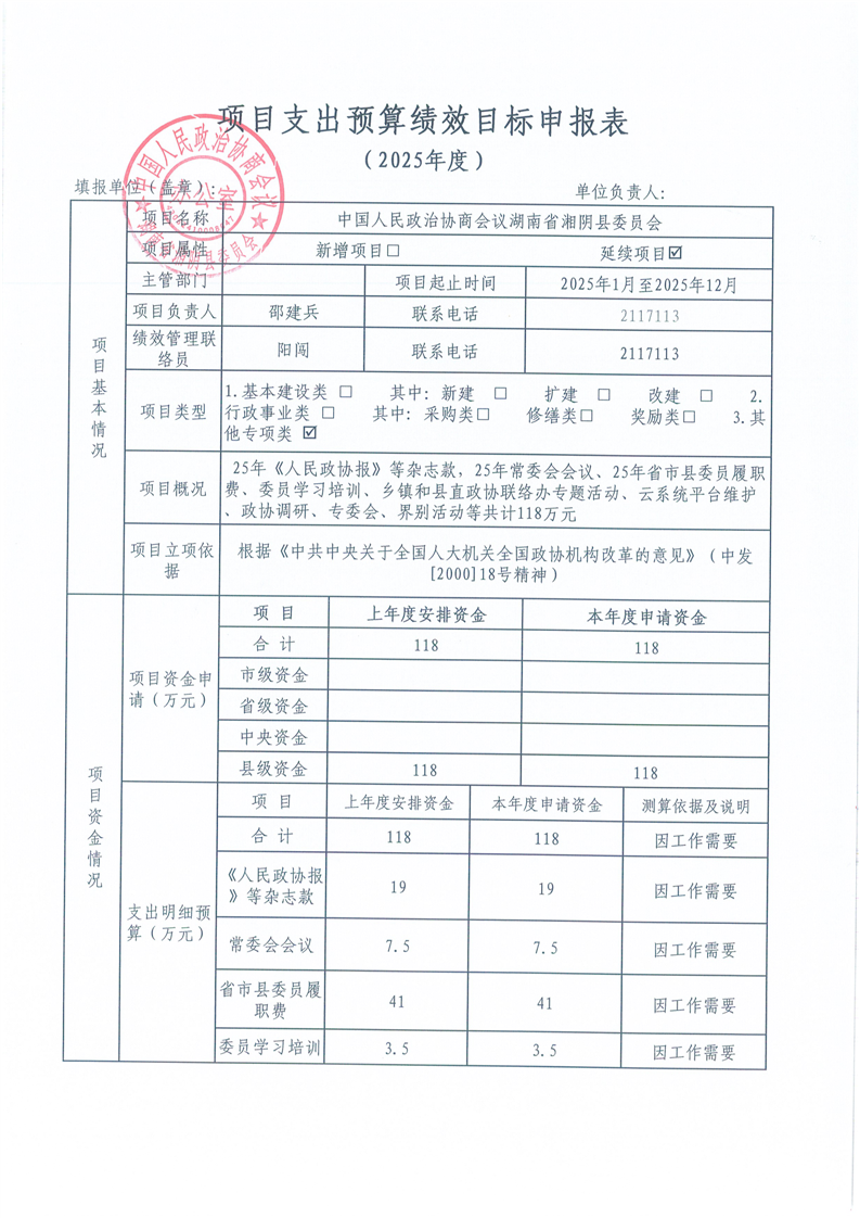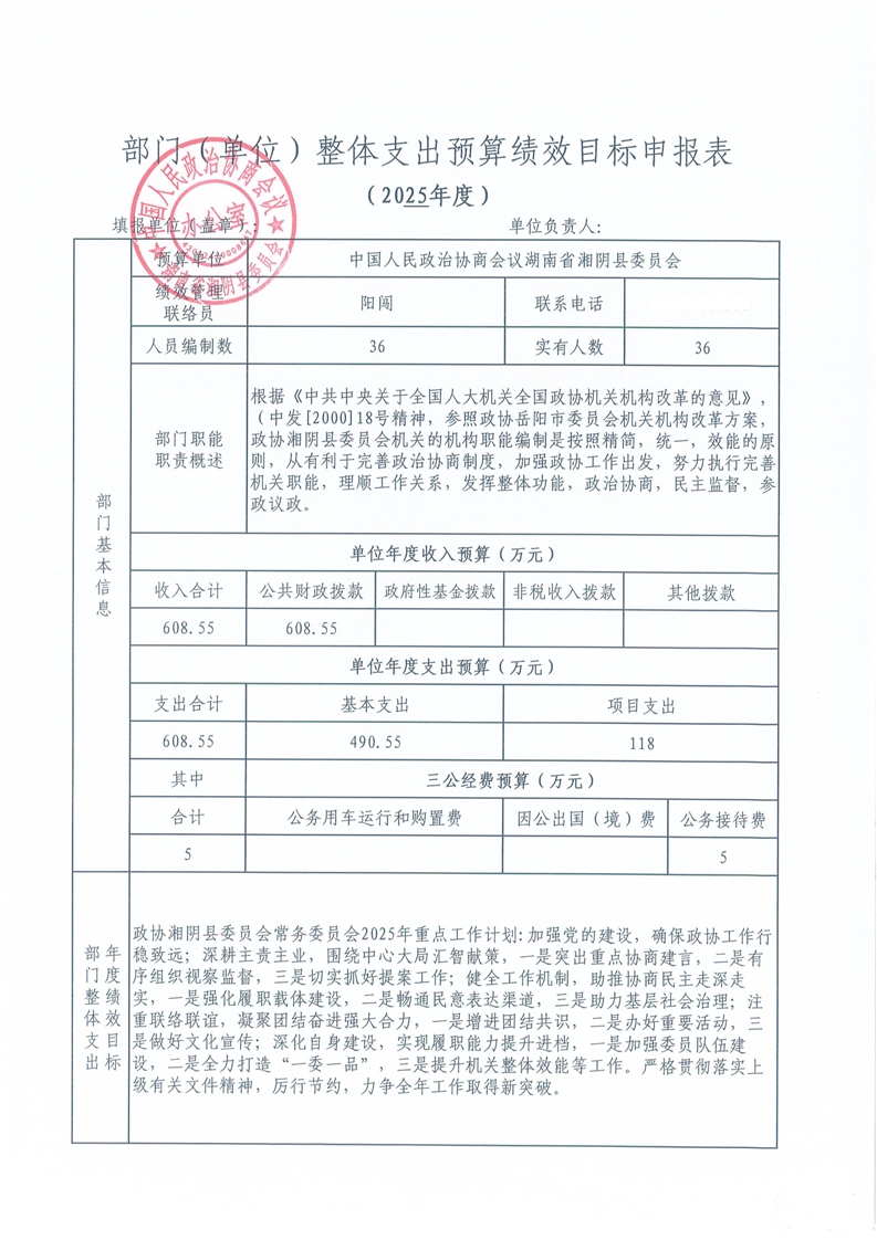 2025年-中国人民政治协商会议湖南省湘阴县委员会-整体支出预算绩效目标申报表公开