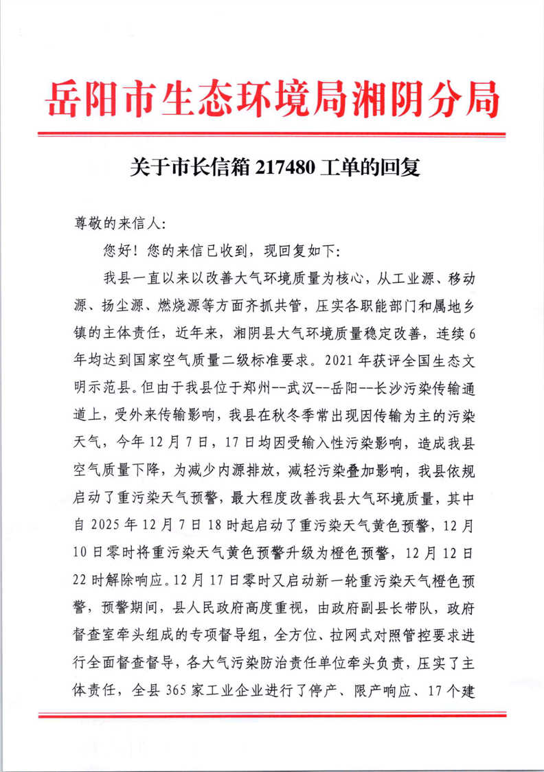 关于市长信箱217480工单的回复