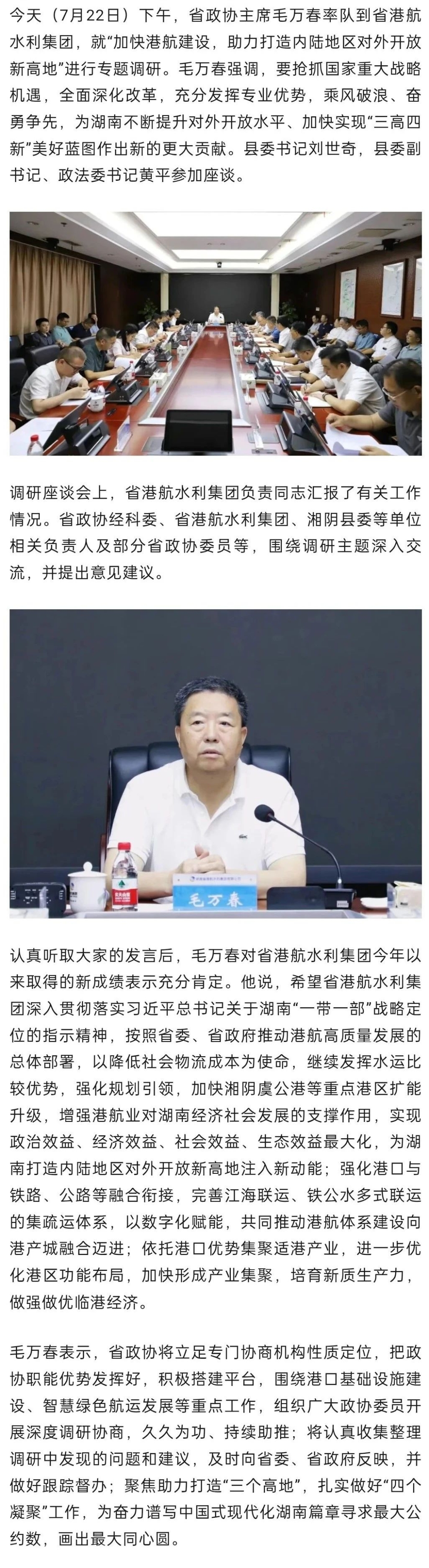 毛万春在省港航水利集团调研:抢抓重大战略机遇 助力打造内陆地区对外开放新高地