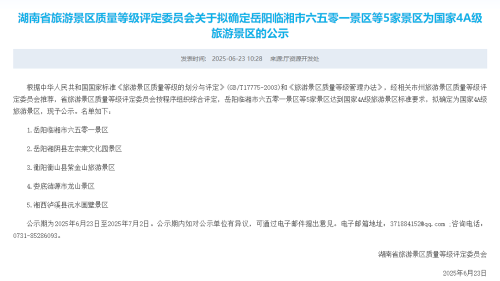 湖南省文化和旅游厅日前发布公示 岳阳临湘市六五零一景区 岳阳湘阴县左宗棠文化园景区达到国家4A级旅游景区标准要求 拟确定为国家4A级旅游景区 现予公示