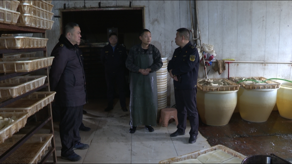 在石塘镇石塘社区,执法人员发现小苏豆制品加工厂在未取得食品生产加工小作坊许可证的情况下从事生产,且现场卫生不达标,食物原材料没有做防鼠、防尘等处理。执法人员依法对经营场所和豆制品予以查封,并责令当事人立即停止无证生产的违法行为。