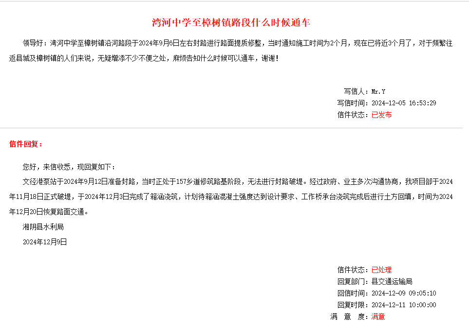 湾河中学至樟树镇沿河路段于2024年9月初左右封路,现在已将近4个月了,之前就咨询过有关部门,给我的来电回复是2024年12月15日通车,书面答复是2024年12月20日恢复路面交通(具体见附件内容),请问是我的日历有问题还是有什么不可抗拒因素导致延期一延再延,如果只是应付了事,那这个平台也没什么存在的价值。失信于民,必消磨民心。另:湘阴的官方渠道如掌上湘阴建议更新此类关乎民生便利的消息,那些大领导在哪里访问在哪里开会什么的,真没有这些影响人民群众日常生活的消息让人关注! |