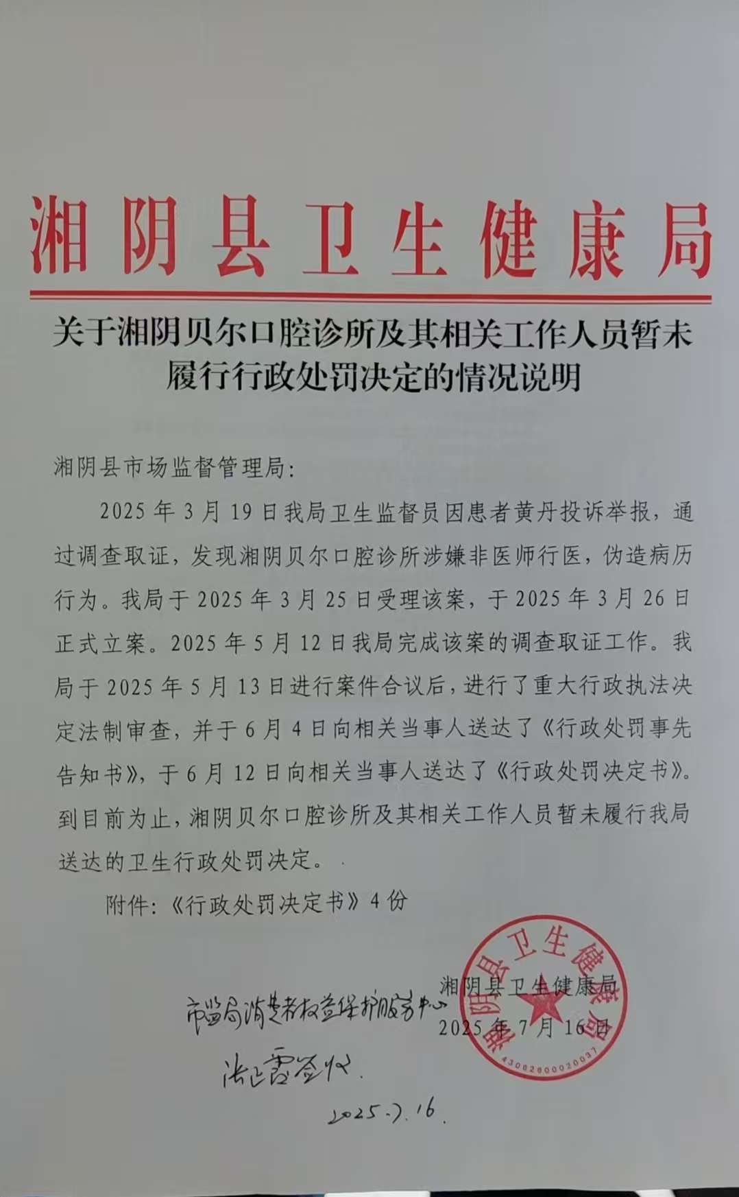 黄丹同志: 您通过线上信箱的来信已收到。 经核实,现回复如下: 1.关于要求依法依规处理,严惩无证行医,超范围经营导致医疗事故且不愿意承担其责任者必须严惩! 自2025年3月26日我局对湘阴贝尔口腔诊所立案调查,通过调查取证发现湘阴贝尔口腔诊所存在以下违法违规行为:1.工作人员非医师行医;2.聘用非卫生专业技术人员开展诊疗活动;3.医师未按照注册的执业地点执业;4.未取得有效的《放射诊疗许可证》擅自开展放射诊疗工作;5.伪造病历资料。到目前为止,我局依据相关法律法规对湘阴贝尔口腔诊所及其相关工作人员下达了《行政处罚决定书》4份,共计下达罚没金额为220340元的行政处罚决定书,并按相关流程正在执行。同时,我局将依法依规对湘阴贝尔口腔诊所超范围执业等问题进行查处。 后续我局将积极组织您与湘阴贝尔口腔诊所进行协调处理,如协调处理不成功,建议您走相关司法途径,我局尽力提供相关支持和帮助。 2.你如有其他关于卫生健康的政策咨询需求,可联系我局信访室,联系电话:0730-2607898;联系地址:湘阴县文星街道东茅路卫生健康局三楼304办公室。 湘阴县卫生健康局 2025年8月15日 |