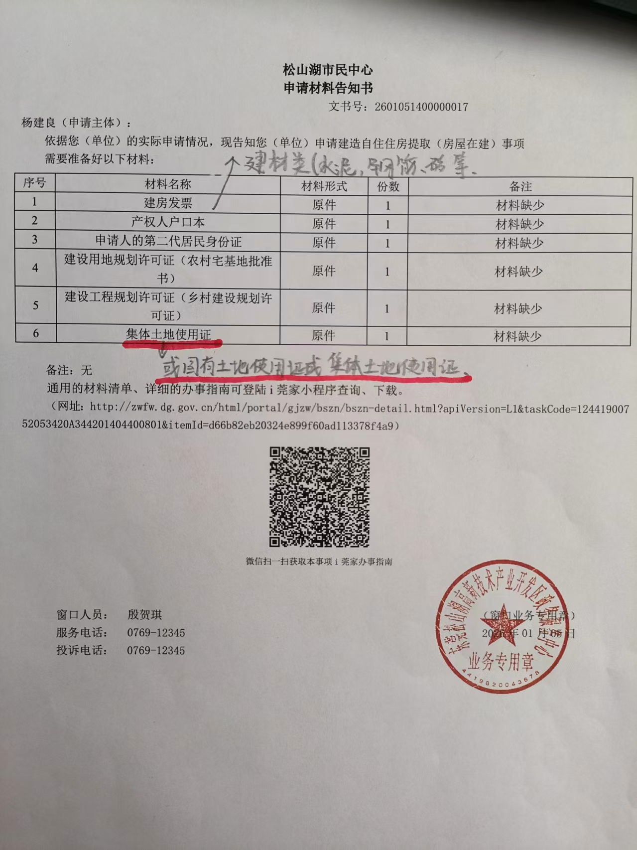 尊敬的各位领导; 本人1月6号去申请建造自住住房提取住房公积金,窗口工作人员告知还差一个证,集体土地使用证或者国有土地使用证。如果没有这两个证其中一个就不能办理. 求助相关部门帮我办理集体土地使用证或者国有土地使用证.非常感谢! 附件1:微信图片20260106.jpg |